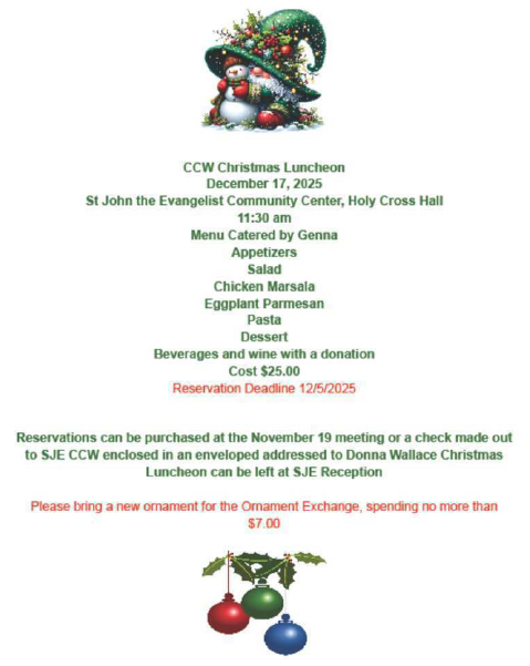 Please let us know how many will attend Fr. Martin's Ordination Anniversary Dinner on 12/27 at 5:30 p.m. in the Hall.